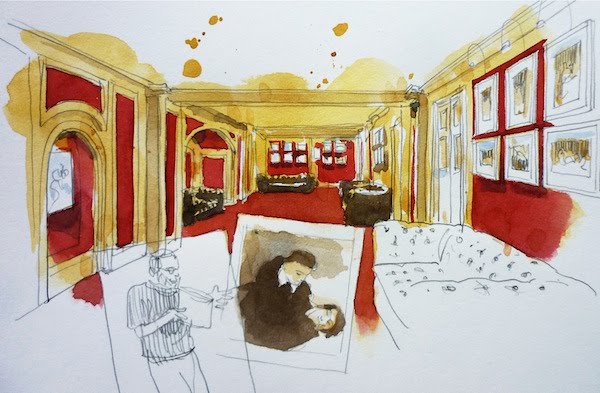 Le Théâtre Edouard VII à Paris, me confie la réalisation d'un carnet de croquis pour fêter son anniversaire. C'est donc avec curiosité que je me suis plongé dans cet univers jusqu'à là inconnu pour moi. La curiosité a vite fait place au plaisir d'avoir à dessiner un lieu si chargé d'histoire, si élégant et harmonieux quoique très chargé en or et rouge (identique à ce qu'était le théâtre à son ouverture il y a un siècle). De mes trois séjours sur place, j'ai ramené une quarantaine de croquis qui feront l'objet d'un carnet dans les jours qui viennent.